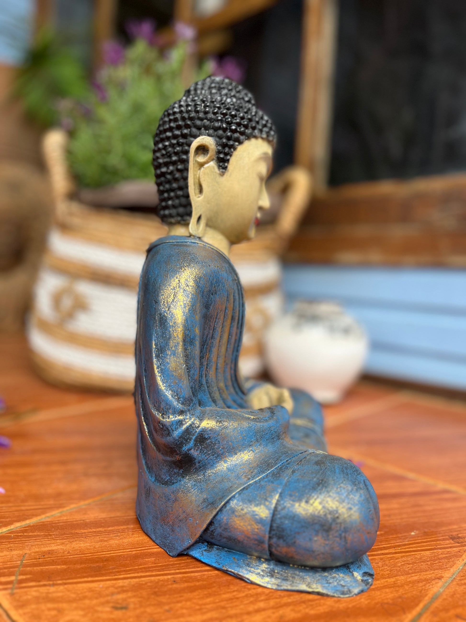 Produzida com resina de alta qualidade, a escultura apresenta traços precisos e detalhes que valorizam a postura meditativa do Buda, tornando-a uma peça de destaque em qualquer ambiente.